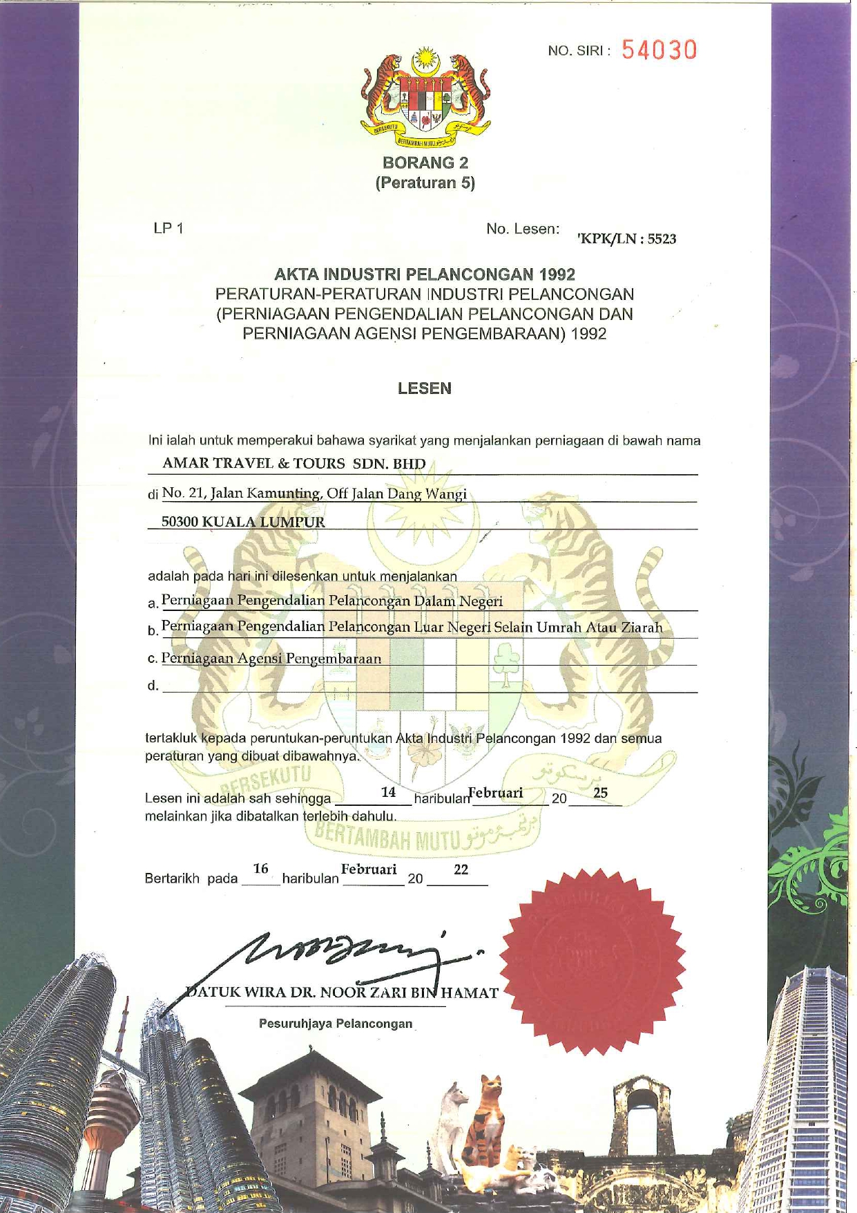 AmarTrips merupakan penyedia perkhidmatan pelancongan yang berlesen dan bertauliah, serta berdaftar sepenuhnya di bawah pihak berkuasa pelancongan tempatan. Kami memiliki lesen operasi pelancongan rasmi dan mematuhi piawaian industri yang ketat – memberi jaminan bahawa anda membuat tempahan dengan syarikat yang sah, boleh dipercayai dan profesional.Bercutilah dengan tenang, disokong oleh kelayakan dan pengiktirafan yang boleh disahkan.